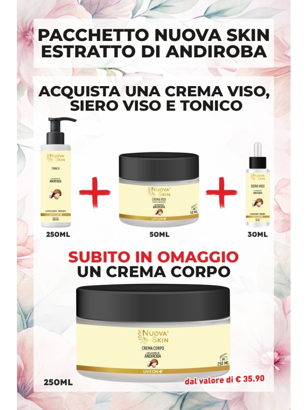 CONTIENE: 1pz NSK0005 - NUOVA SKIN CREMA VISO ANDIROBA 50ML1pz NSK0012 - NUOVA SKIN SIERO VISO ANDIROBA 30ML1pz NSK0033 - NUOVA SKIN TONICO ANDIROBA 250ML1pz NSK0040...